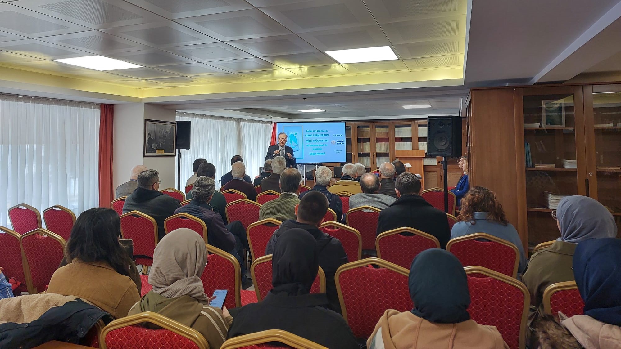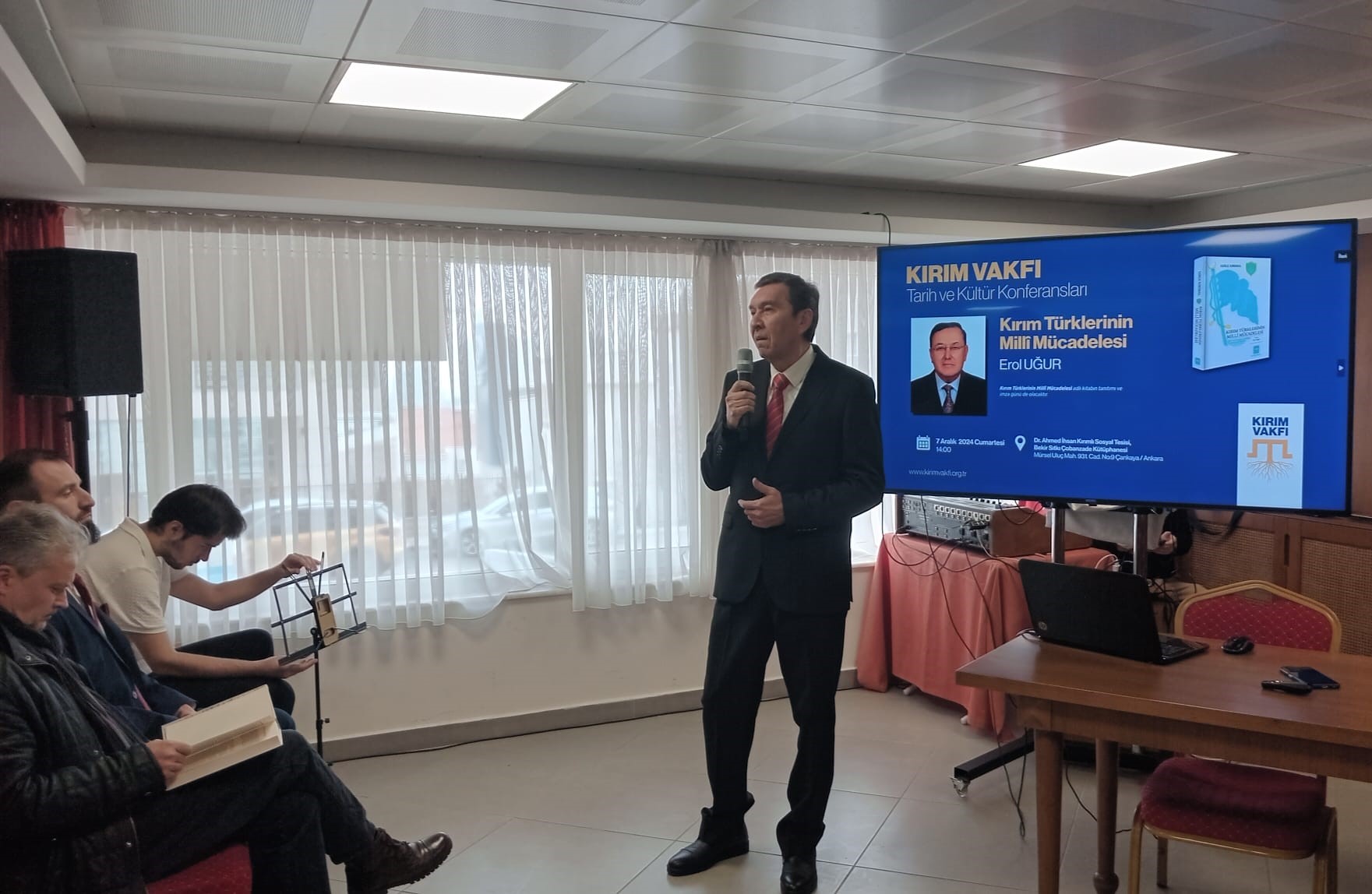 Emekli Tuğgeneral Erol Uğur, Kırım milli hareketine yönelik bütün çalışmalarda Dr. Edige Kırımal’ın doktora tezi olan ve 1952 yılında yayınlanan “Der nationale Kampf der Krimtürken” adlı eserin verildiğini, ancak bugüne kadar neden Türkçeye tercüme edilmediğini ve bu sorunun cevabını uzun süre aradığını belirterek konferansına başladı.