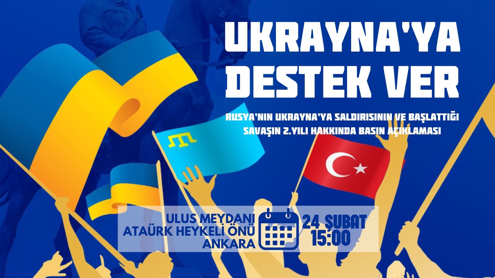 Rusya’nın Ukrayna topraklarında başlattığı işgal ve saldırılara karşı durduğumuzu göstermek için Ukrayna Derneği’nin 24 Şubat 2024 Cumartesi günü düzenlemiş olduğu basın toplantısında “Ukrayna’ya Destek Ver”erek saat: 15.00'de Ankara’da Ulus Meydanı Atatürk Heykeli önünde olacağız.