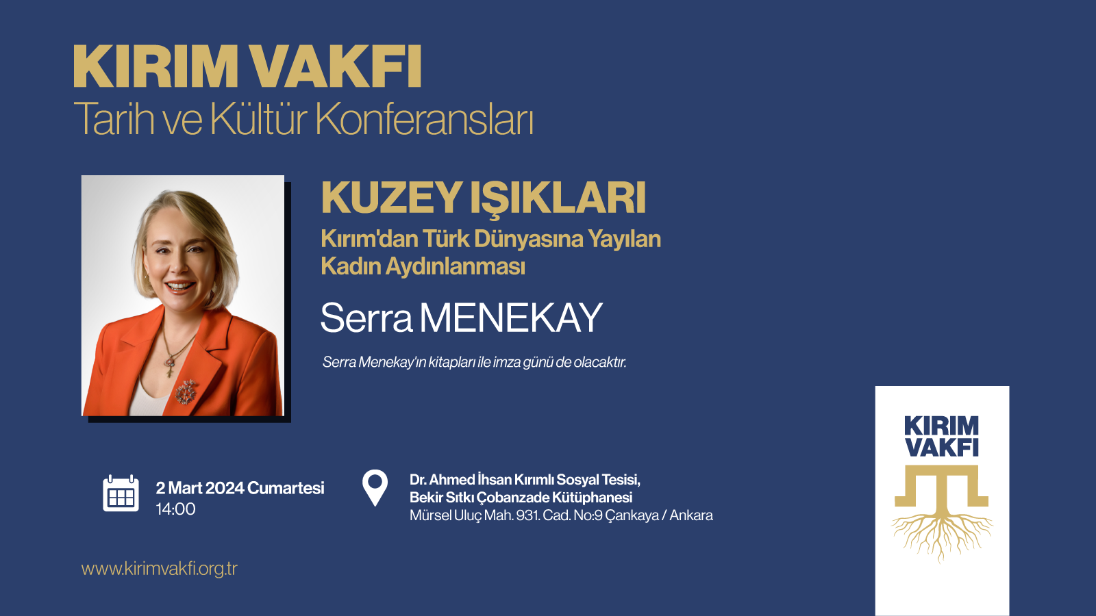“Tarih ve Kültür Konferansları”mız çerçevesinde 2 Mart 2024 tarihinde Serra Menakay ile düzenleyeceğimiz “KUZEY IŞIKLARI – Kırım'dan Türk Dünyasına Yayılan Kadın Aydınlanması” adlı konferansa ve imza gününe bütün dostlarımızı davet ediyoruz.